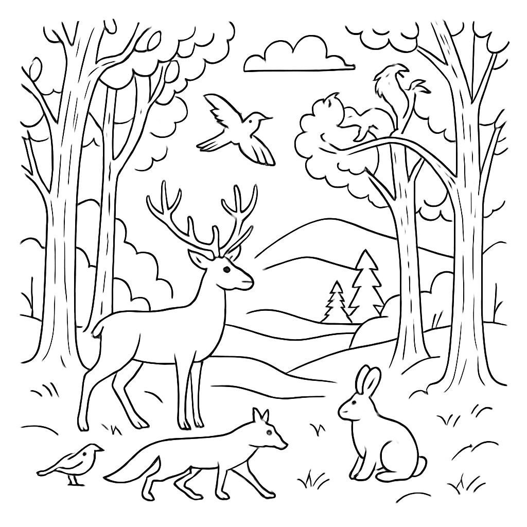 Eine malerische Szene im Wald mit verschiedenen Tieren, Bäumen, Landschaft und Himmel.