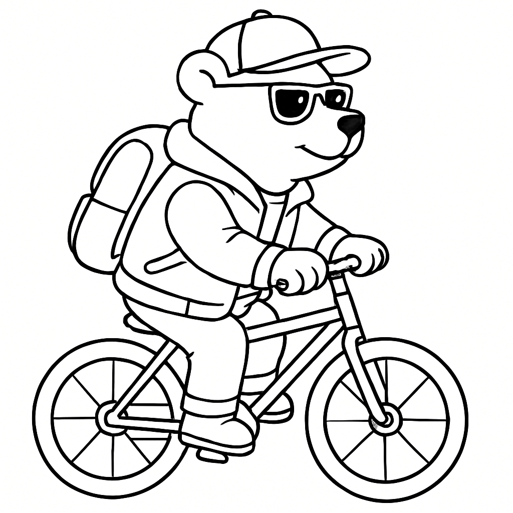 Cool bear with backpack, baseball cap, and jacket biking to school.